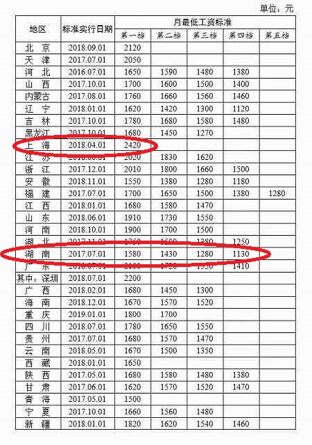 中国の最低月給表です。