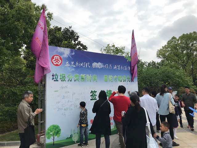 ゴミの分別会でも来場者がサインをするための壁…